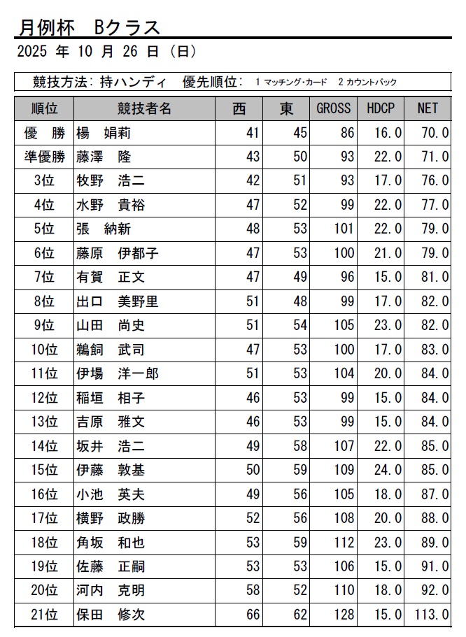 HOME > インフォメーション > 2025・10月 月例杯 Bクラス