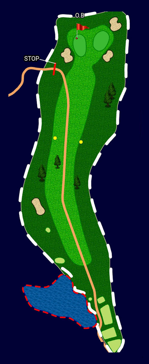 フェアウェイ左のバンカーより左に飛んだ球は池に入ってOBの可能性あり。「暫定球」を。