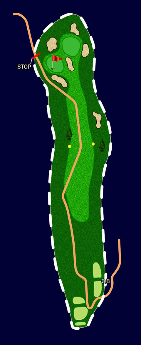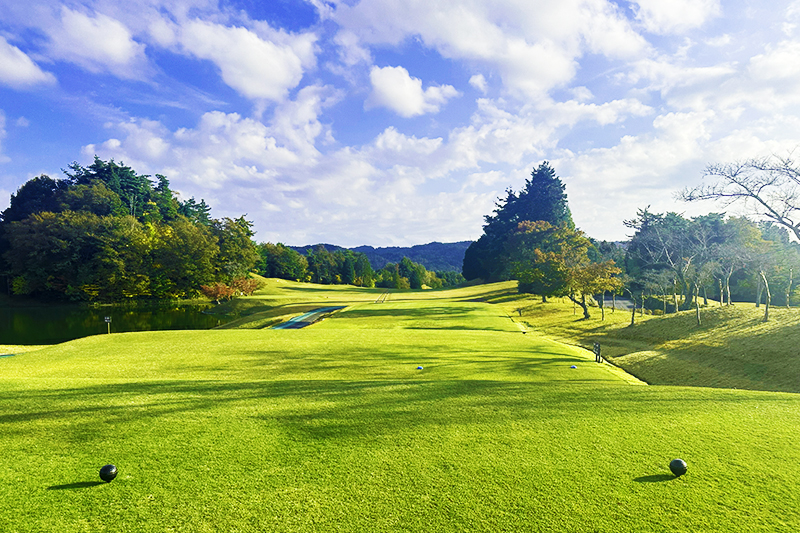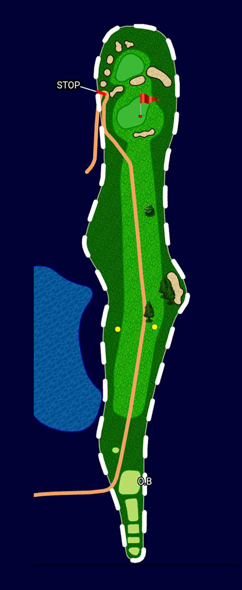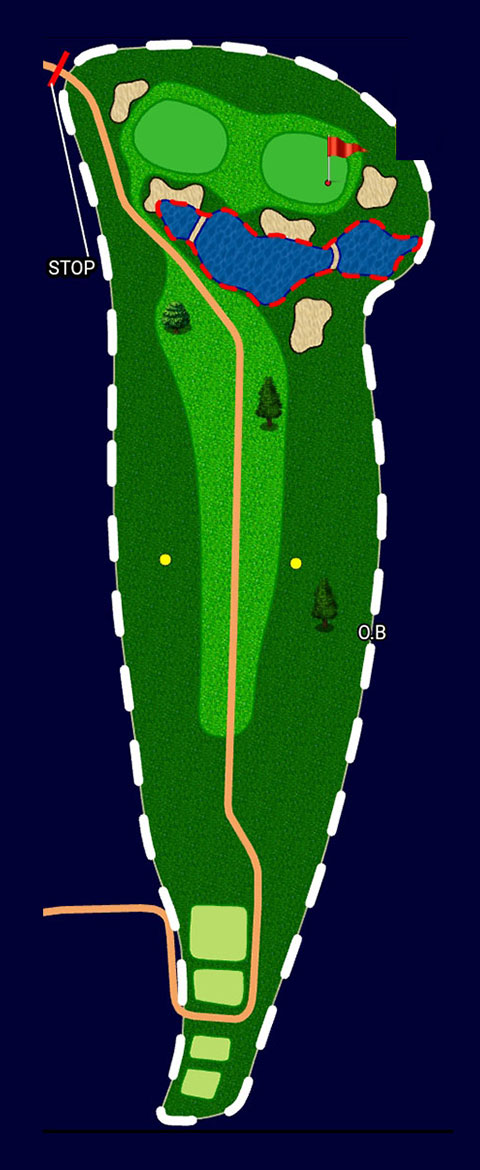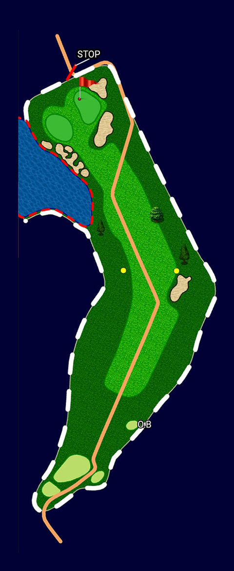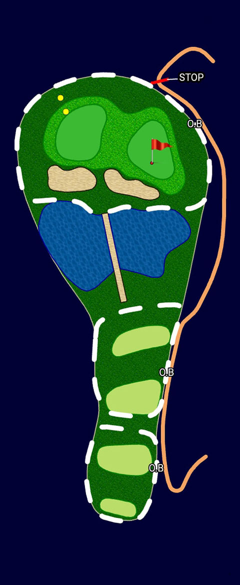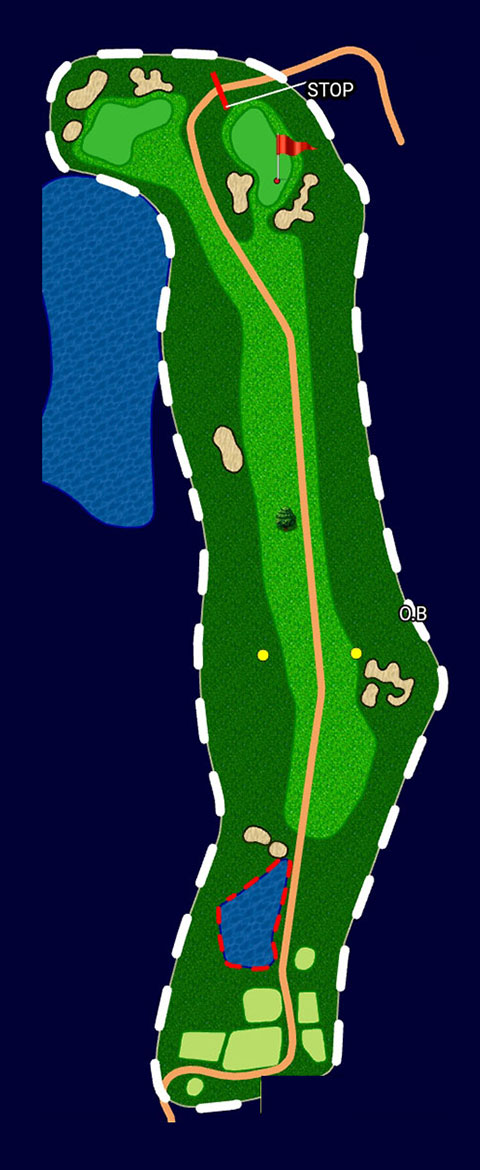 フェアウェイ左のバンカーより左に飛んだ球は池に入ってOBの可能性あり。「暫定球」を。